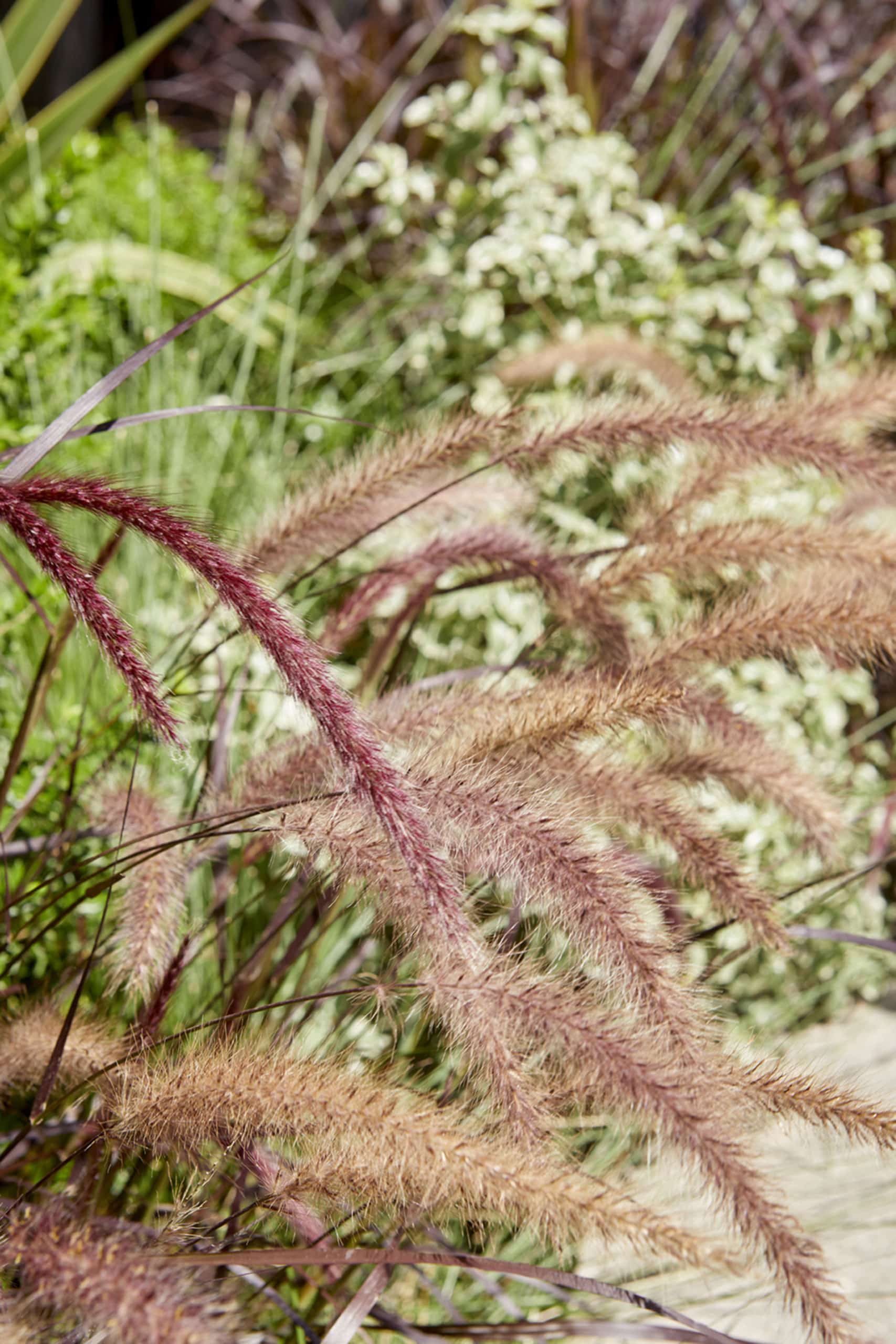 Gramínies com Stipa tenuissima i Muhlenbergia rigens aporten moviment i lleugeresa mentre que plantes perennes com Myrtus communis Microphylla i Pittosporum tenuifolium ofereixen estructura i densitat visual. La Mahonia media Charity destaca amb les seves flors grogues estacionals i espècies com Pennisetum advena Carex brunea i Ophiopogon japonicus afegeixen textures elegants i funcionals.
